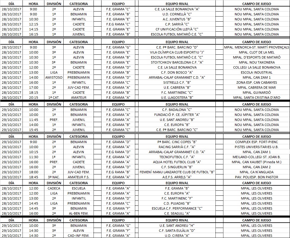 Agenda de partits dels nostres equips (28 i 29 d’octubre)