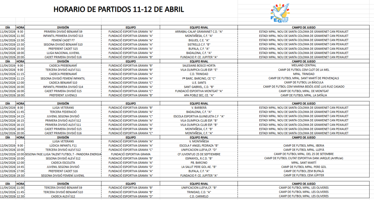 Horaris de partits (11-12/04/2026)