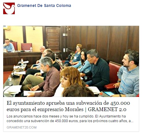 Ante la información publicada por el periodista Jordi Corachán de Gramanet 2.0 de que elAyuntamiento de Santa Coloma de Gramanet aprobó una subvención de 450.000 € para elempresario Morales, y leída detenidamente la respuesta fundamentada, documentada ycontundente de Antonio Morales, al que conozco desde hace muchos años y he seguido sutrayectoria personal, empresarial, deportiva y social, que por cierto ha sido intachable.