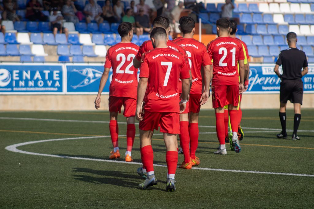 Això és el que van mostrar des d’un inici els colomencs, equipats per primer cop amb l’indumentària vermella de Kappa, que ja des del primer minut de joc van dominar el partit. De fet, abans d’arribar al minut 20, la Grama va gaudir de fins a 5 ocasions clares de gol, totes molt ben refusades pel porter de la Rapitenca. Peris i Kilian, protagonistes en atac, estaven actius i causaven mal de cap a la defensa local. La Grama dominaria durant la resta del primer temps però no arribaria el gol abans del descans; per tant, en marxar a vestidors, el marcador seguiria amb el resultat inicial.