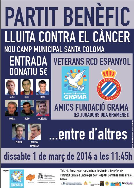 La solidaritat de tots els participants com l’alcaldessa de Santa Coloma, Núria Parlon, el Tinent d’Alcaldia, Esteve Serrano, el conseller d’Esports, Diego Arroyo, més el portaveu de ICV-EUiA, Siscu Sánchez i el portaveu de CiU, Carles Combarros van col.laborar per aquesta causa solidària del partit entre Veterans del RCD Espanyol contra els Amics de la Fundació Grama composat per exjugadors de la UDA Gramenet!