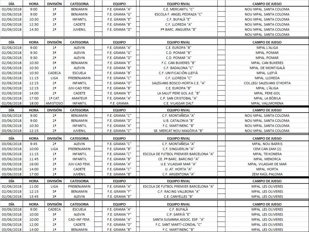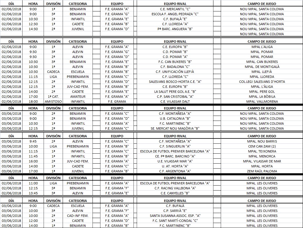 Agenda de partits dels nostres equips (2 i 3 de juny)