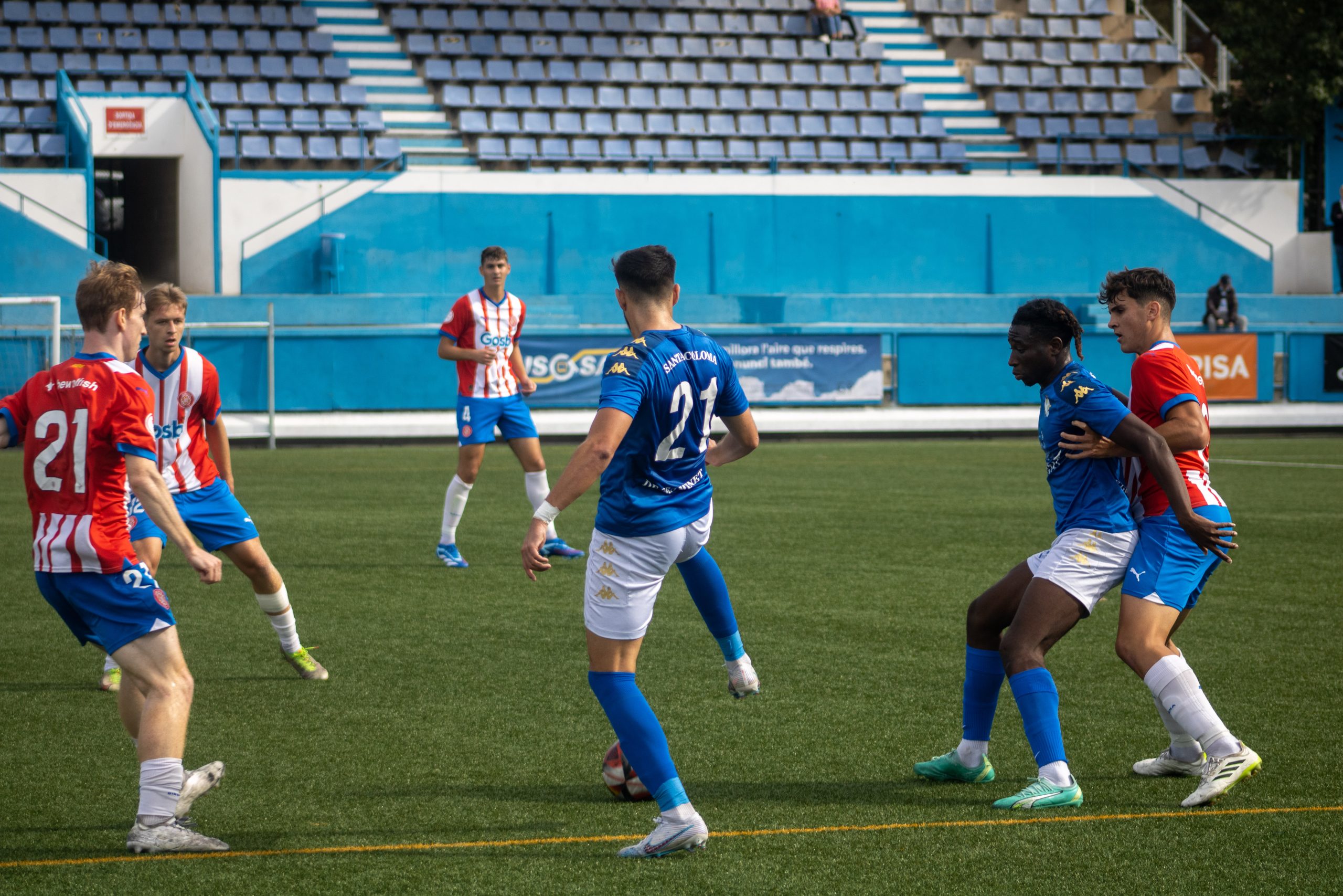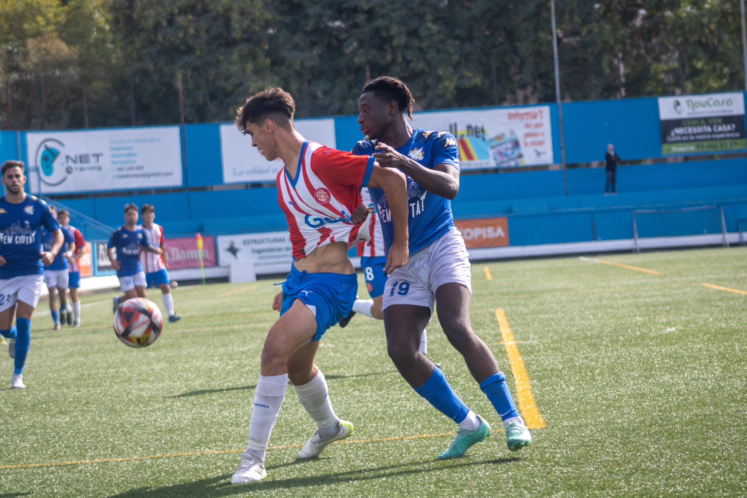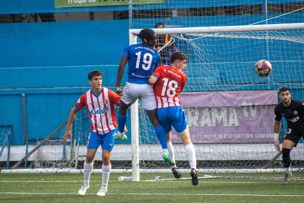 L’inici del duel va estar marcat pel domini colomenc, que va ser constant cap a la porteria dels gironins. Els de Jose Solivelles tenien clar que era clau començar bé i és per això que van saltar a la gespa del Municipal de la Grama amb intenció d’anotar el primer gol. De fet, els atacs colomencs eren constants i el Girona només s’acostava a la porteria de Sergio amb contraatacs. S’arribaria al descans amb el 0-0 inicial.